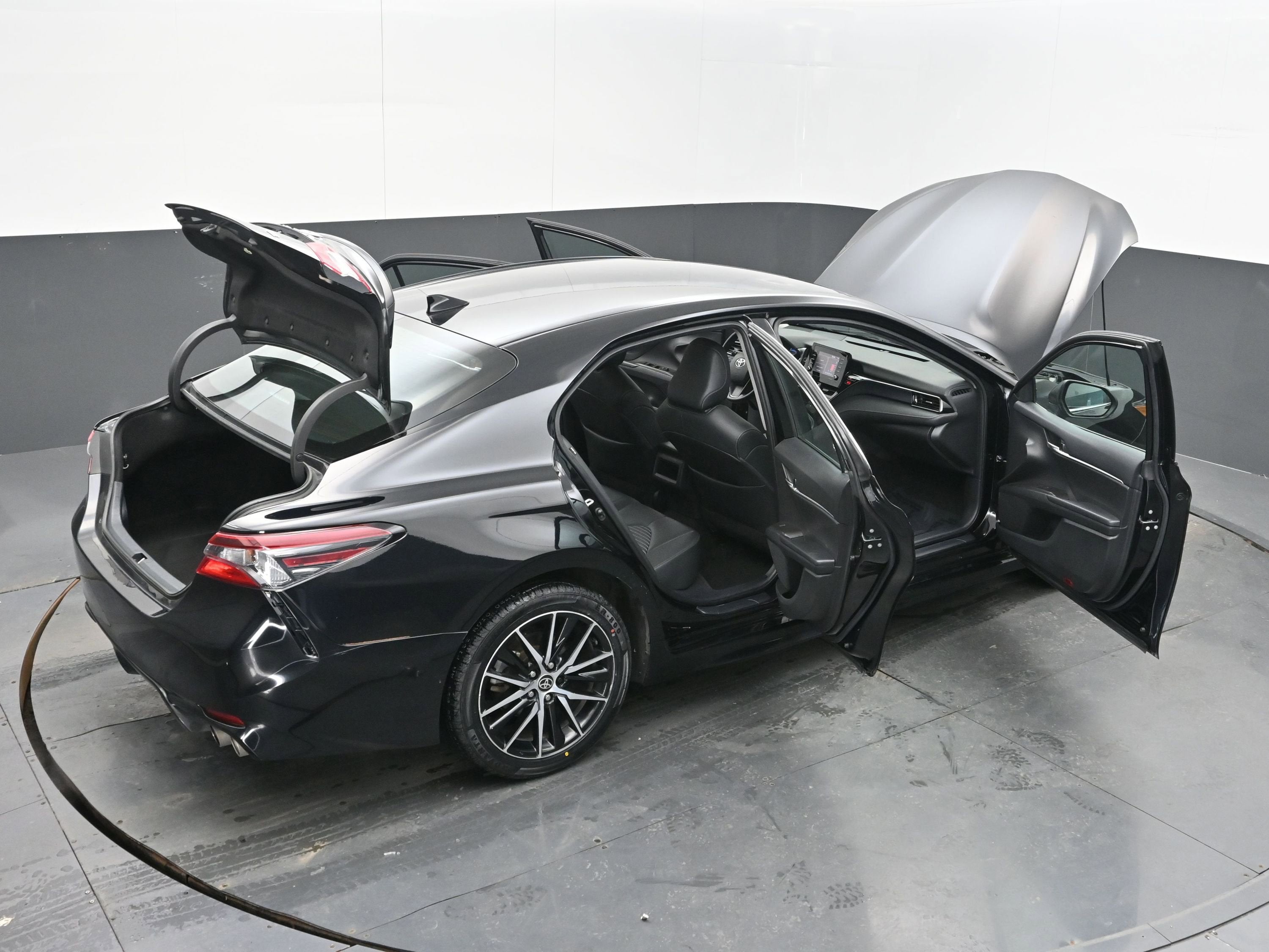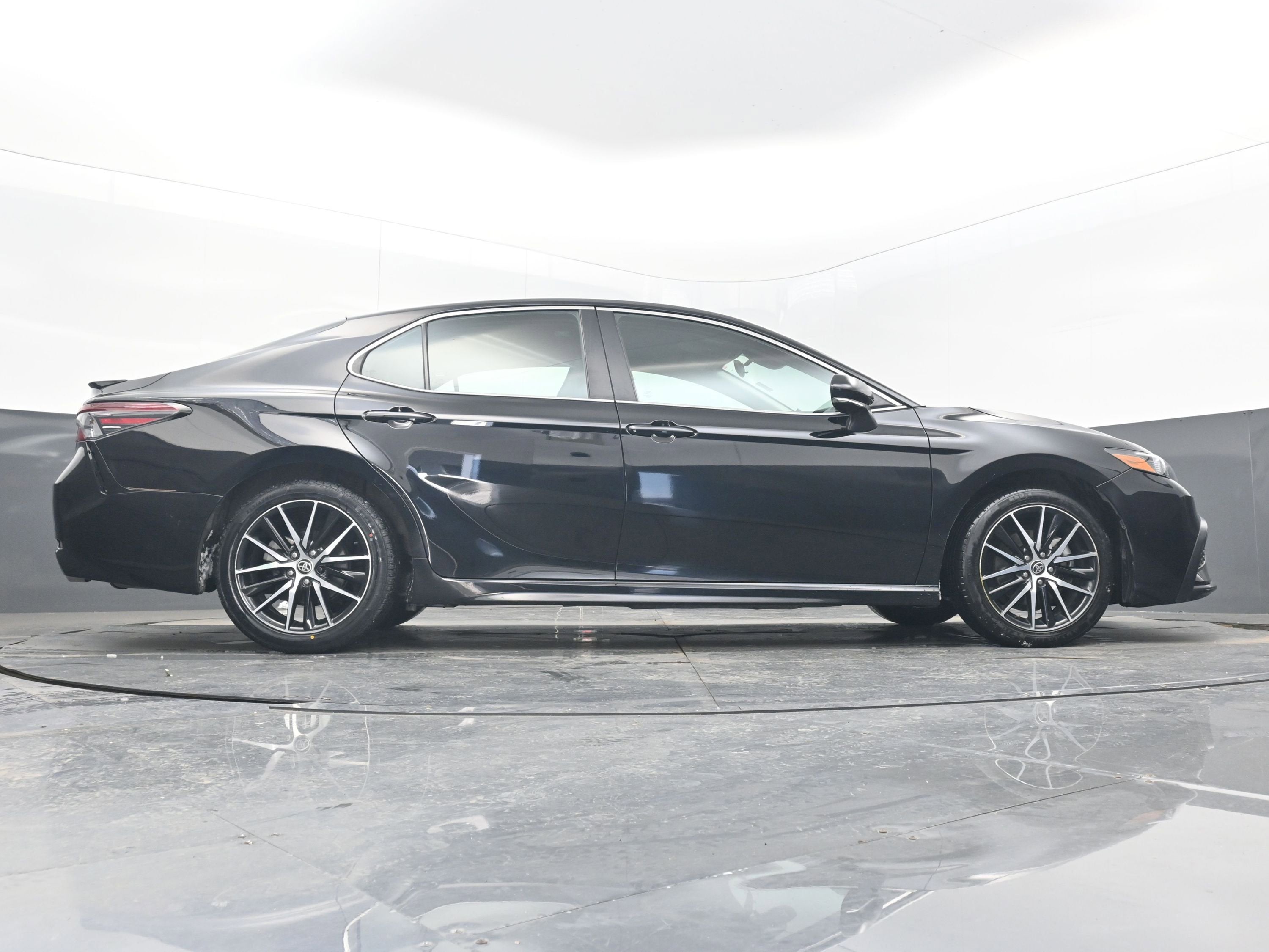 Turn heads with the Camry's sleek design, featuring a bold black grille, body-colored bumpers, and 18-inch machined aluminum wheels. The Midnight Black Metallic exterior not only exudes sophistication but is also complemented by practical features like LED headlights and automatic high beams, ensuring optimal visibility day or night.